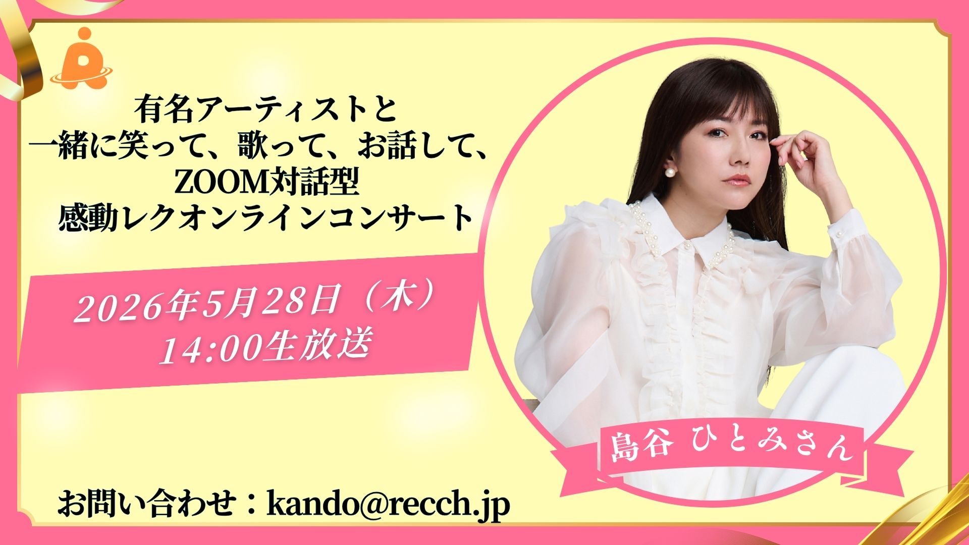 本日は、少し先のお楽しみ!5月28日に開催される「感動レクオンラインコンサート」の超豪華なスペシャルゲストをご紹介します。圧倒的な歌唱力と透明感あふれる歌声で、世代を超えて愛され続ける歌姫、島谷ひとみさんをお迎えします!