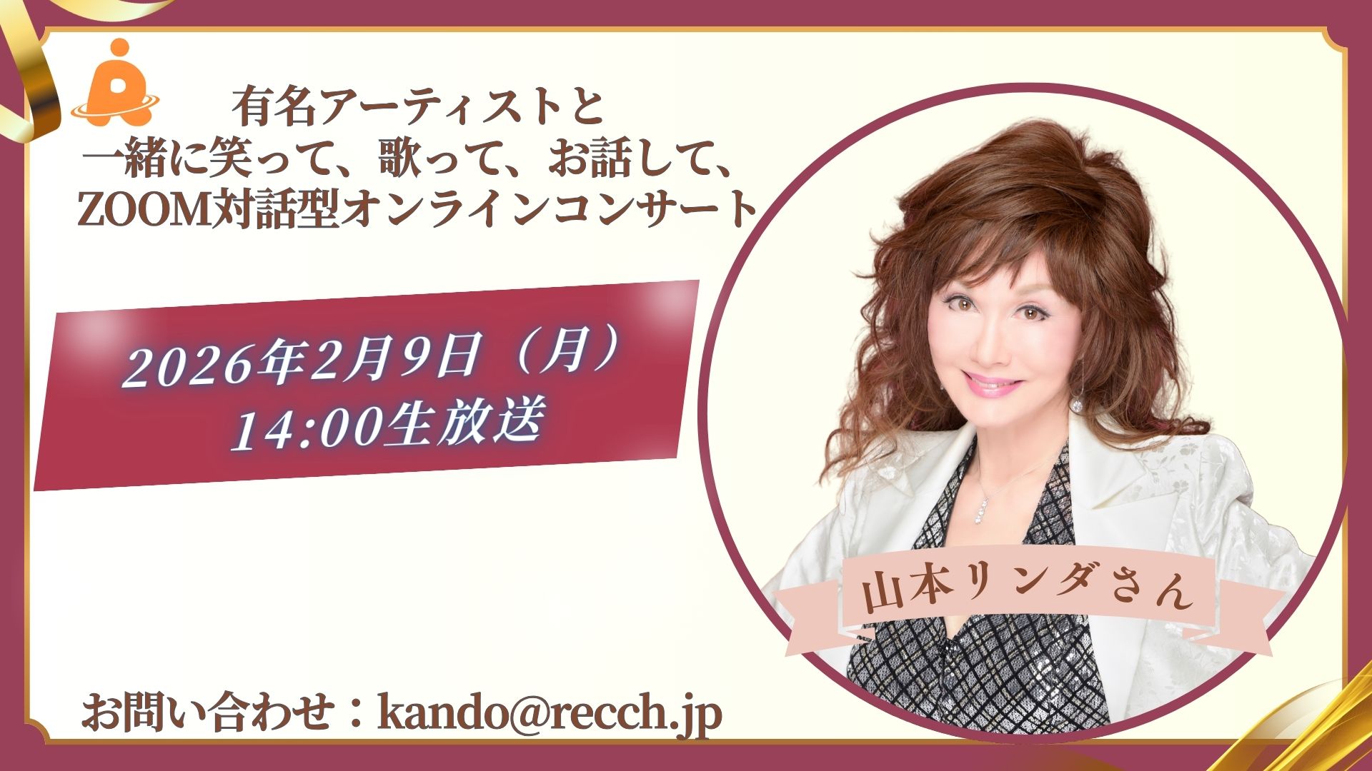 そんな寒さを吹き飛ばし、心も体もポカポカ温まるようなビッグゲストの出演が決定いたしました! 今回の感動レクオンラインコンサートにお迎えするのは、山本リンダさんです!