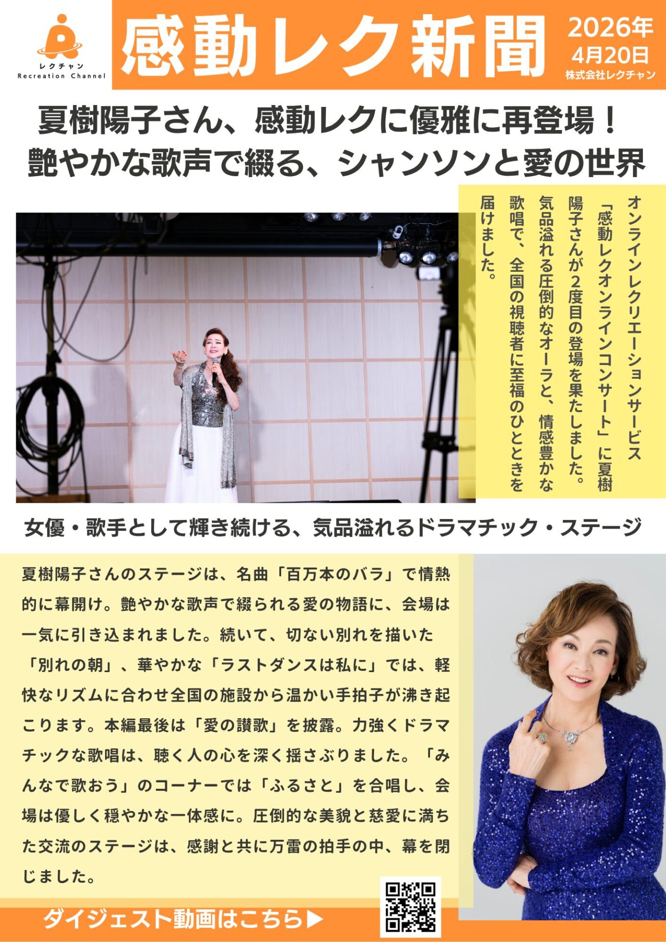 2026年4月20日、高齢者施設向けオンラインレクリエーション「感動レク」に、女優・歌手として圧倒的な存在感を放つ夏樹陽子さんをお迎えしました! 今回で2回目のご出演となる夏樹さん。前回の出演時も、その気高くも温かいお人柄に多くのファンが魅了されましたが、今回も開催前から「また夏樹さんに会える!」と全国の施設様から期待の声が寄せられていました。