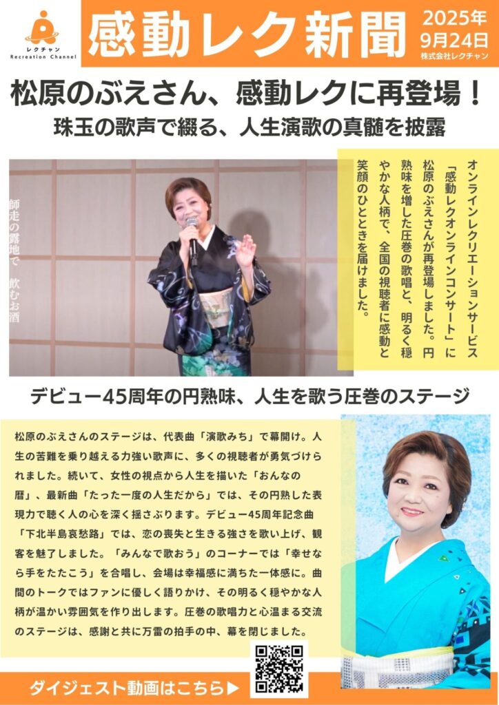 2025年9月24日(水)、その力強くも繊細な歌声で聴く人の心を掴んで離さない演歌歌手・松原のぶえさんが、株式会社レクチャンが提供する高齢者向けオンラインレクリエーションサービス「感動レクオンラインコンサート」に2回目の登場を果たしました。円熟味を増した圧巻の歌唱と、明るく穏やかな人柄で、全国の視聴者に感動と笑顔のひとときを届けました。