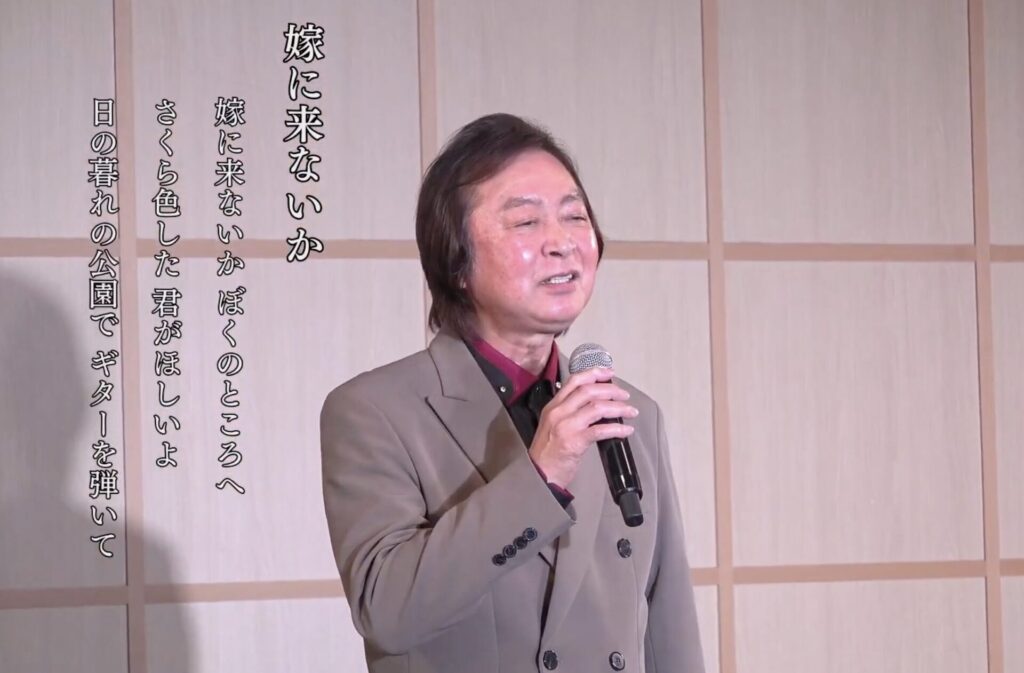 幕開けを飾ったのは、1976年の大ヒット曲『嫁に来ないか』。イントロが流れた瞬間、施設では「待ってました!」と言わんばかりの笑顔が溢れました。新沼さんの温かい人柄が滲み出るような優しい歌声に、当時の青春時代を思い出し、リズムに合わせて体を揺らす利用者様の姿が多く見受けられました。