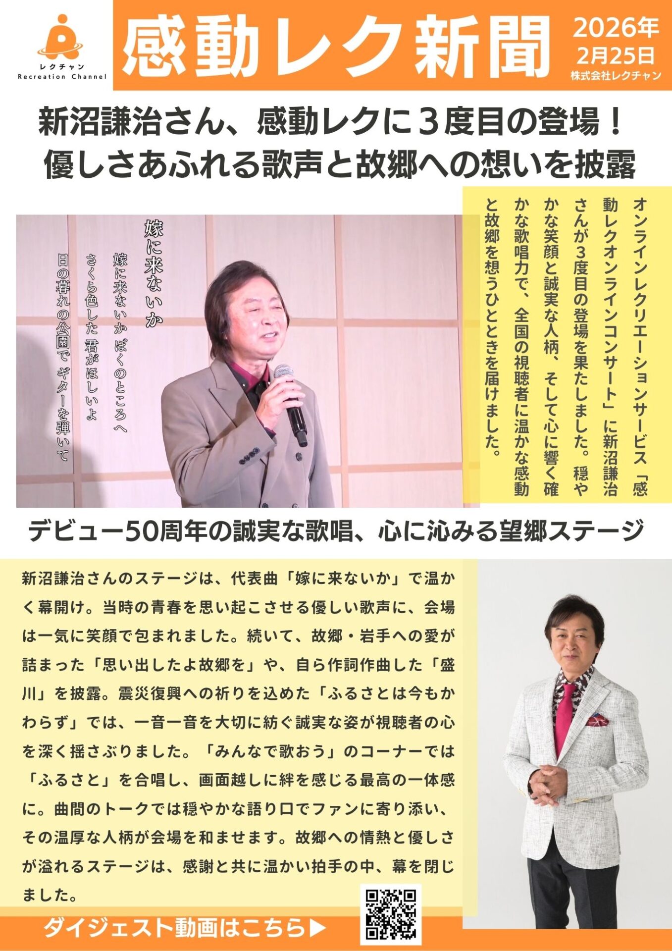 2026年2月25日、高齢者施設向けオンラインコンサート「感動レク」に、演歌界のスターであり、私たちの「おなじみの顔」でもある新沼謙治さんをお迎えしました。